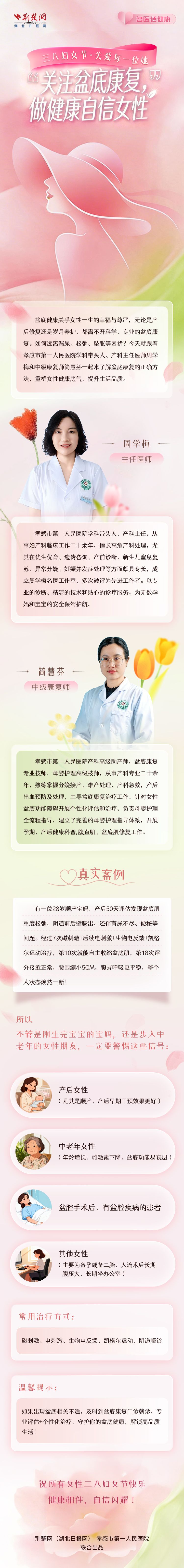 盆底健康關(guān)乎女性一生的幸福與尊嚴(yán),無論是產(chǎn)后修復(fù)還是歲月養(yǎng)護(hù),都離不開科學(xué)、專業(yè)的盆底康復(fù)。如何遠(yuǎn)離漏尿、松弛、墜脹等困擾?現(xiàn)在就跟著孝感市第一人民醫(yī)院學(xué)科帶頭人、產(chǎn)科主任醫(yī)師周學(xué)梅和中級康復(fù)師簡慧芬一起,了解盆底康復(fù)的正確方法,重塑女性健康底氣,提升生活品質(zhì)。
