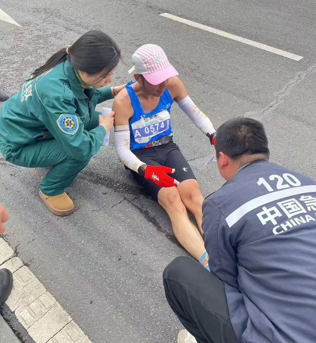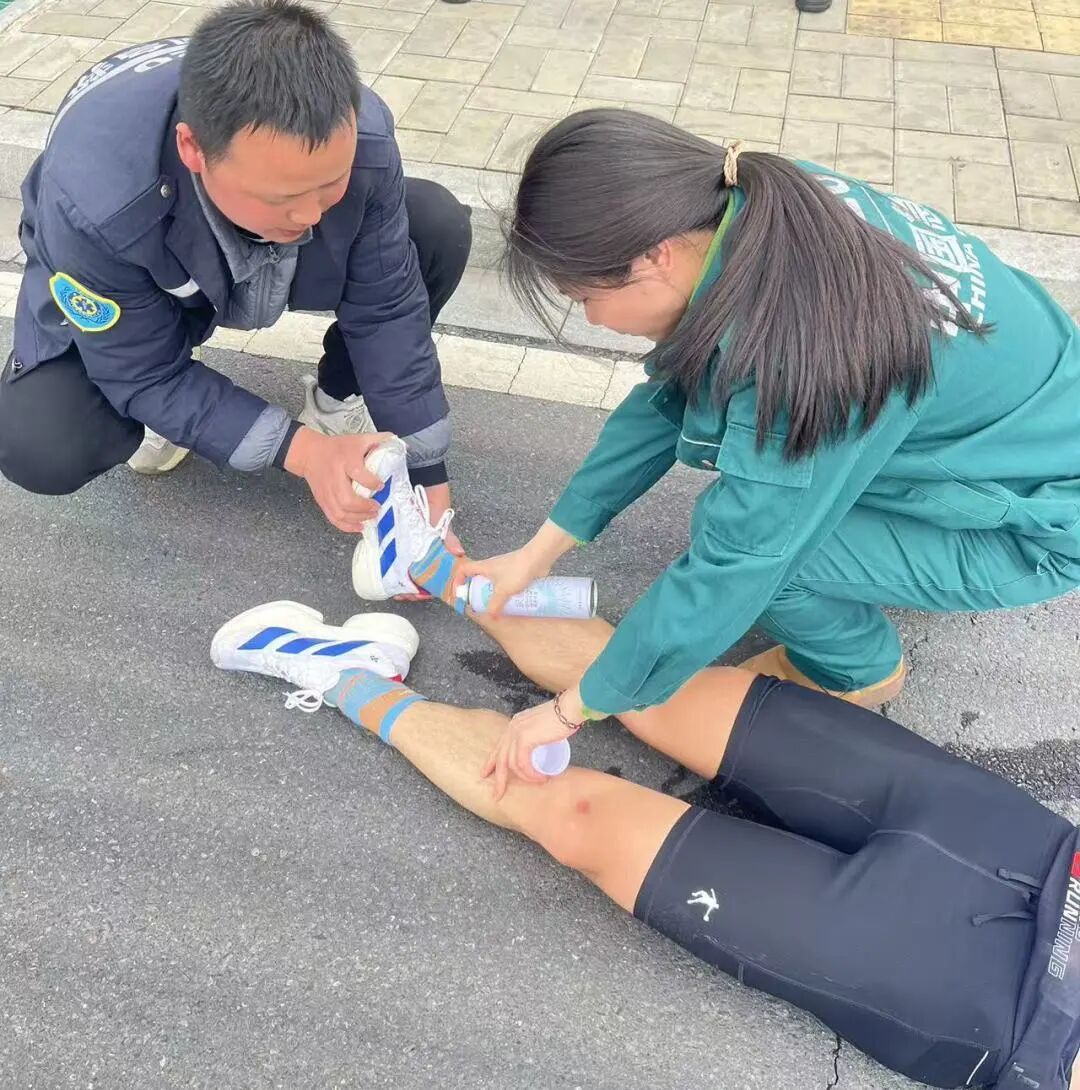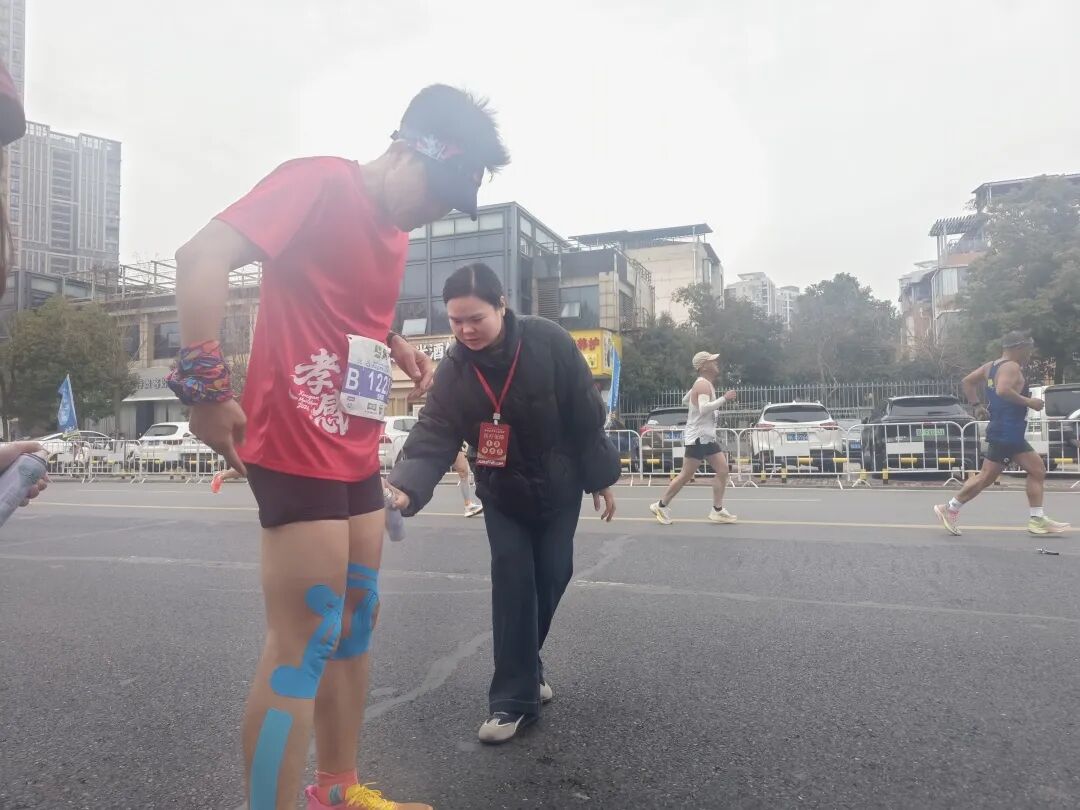 “膝蓋不舒服是嗎?來,坐下我?guī)湍纯??!痹谌R37.5km處,醫(yī)生劉書明已經記不清這是第幾次蹲下為跑者處理傷情。肌肉拉傷、關節(jié)扭傷、皮膚擦傷……面對各種常見運動損傷,他和搭檔張春珍、嚴郁婷處置精準,還不忘送上句句加油暖心鼓勵。