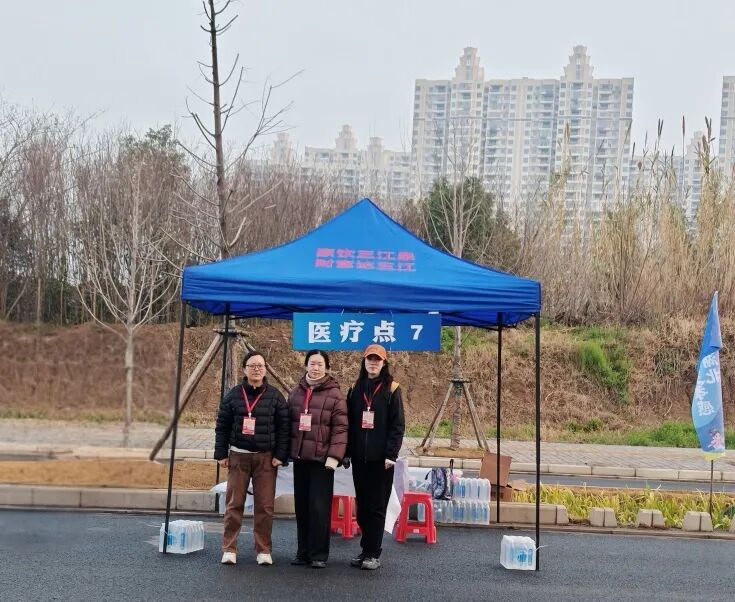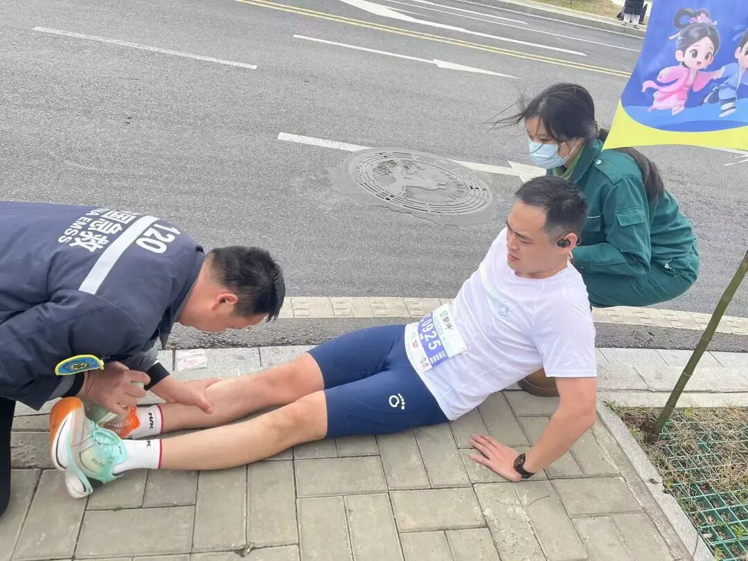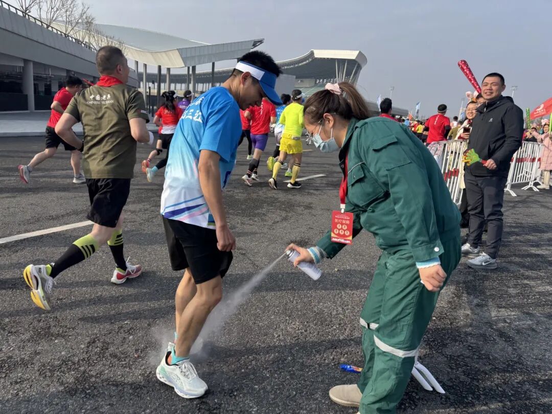 在12.5km處的醫(yī)療站點,醫(yī)生陳杏和護士唐慧賢、祝敏的目光始終追隨著賽道上的每一個身影。這里是半程馬拉松的關鍵節(jié)點,也是選手體能消耗的“預警區(qū)”?!坝信苷叱霈F(xiàn)腿部痙攣,需要處理!”三人迅速進入狀態(tài),噴霧、按摩、補液……一套操作行云流水。