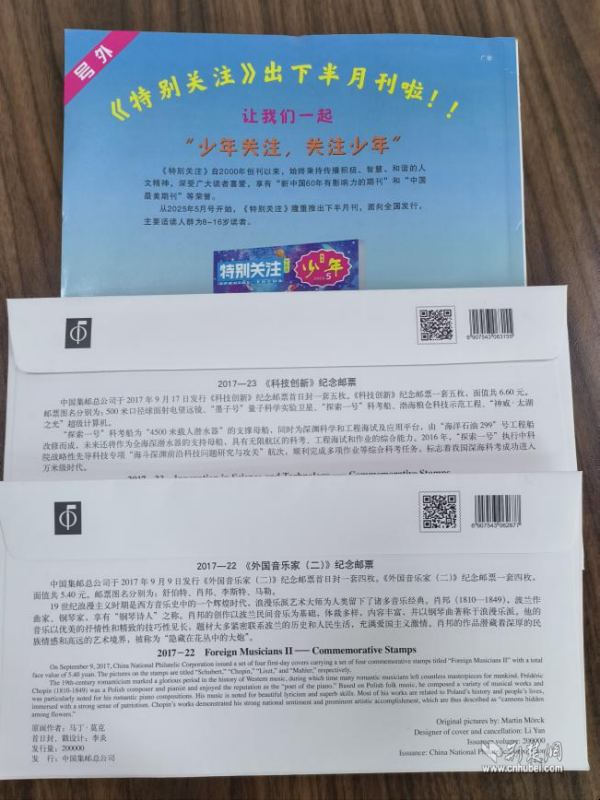 活動伊始,武昌區(qū)郵政分公司精心準(zhǔn)備了一份份“精神食糧”,將科技創(chuàng)新、音樂家等不同主題的首日封以及《特別關(guān)注》雜志贈送給參與活動的小朋友們。首日封上精美的郵票圖案記錄著時代的印記,雜志中蘊(yùn)含的人生智慧啟迪著幼小的心靈。