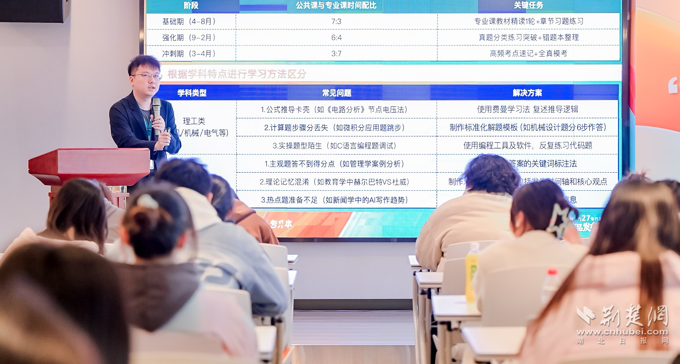 備考先知情,方能贏在起點。發(fā)布會上,教學負責人胡誠林,圍繞湖北省專升本公共課考情回顧及2027備考規(guī)劃展開詳細分享。他重點拆解了《大學英語》這一核心公共課的考試要求、題型迭代規(guī)律及難度變化趨勢,針對考生最關心的詞匯積累、語法掌握、閱讀理解、書面寫作四大模塊,提供了可落地、可執(zhí)行的備考策略。從詞匯記憶的高效方法、語法考點的重點突破,到閱讀技巧的精準運用、寫作能力的分層提升,胡誠林老師進行了全方位、系統(tǒng)化的解析,為考生搭建起清晰的公共課備考框架,幫助大家精準把握備考節(jié)奏,做到游刃有余。