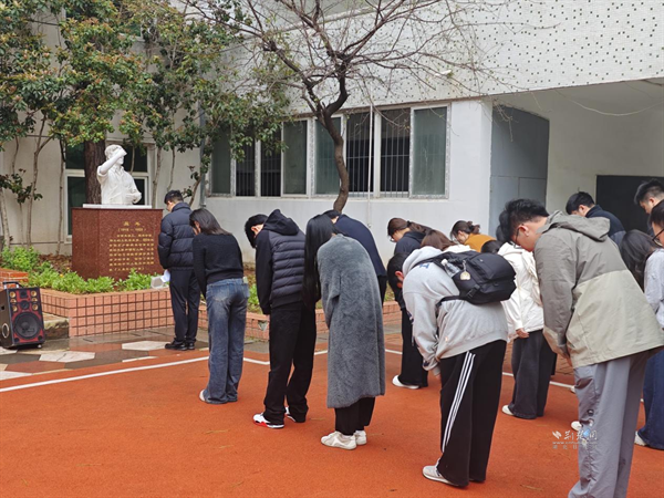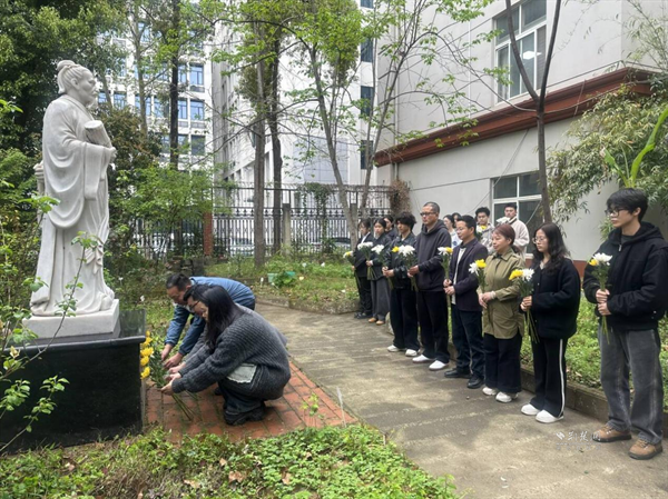 4月3日上午,在求索書(shū)院屈原塑像前,在“荊楚風(fēng)流”與“玉蘭學(xué)府”群體塑像旁,文學(xué)院師生代表為屈原、李白、蘇東坡、魯迅等文學(xué)巨匠的塑像細(xì)細(xì)拂拭塵埃,敬獻(xiàn)素菊。師生們低首默哀,仿佛穿越時(shí)空,與先賢展開(kāi)一場(chǎng)跨越千年的對(duì)話。