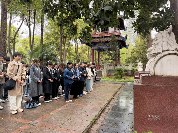 文學(xué)院師生代表在楚風(fēng)園的荊楚風(fēng)流—-歷史名人漢白玉雕像區(qū)向炎帝、楚先王、楚莊王、老子、屈原、王昭君、諸葛亮、孟浩然、陸羽、畢昇、李時(shí)珍、張居正、張之洞等先賢拜祭并獻(xiàn)花。 通訊員周晚霞 攝