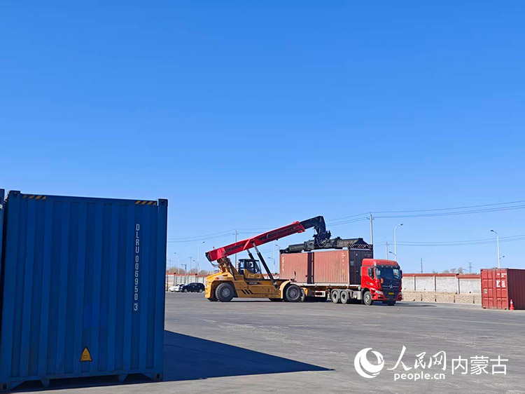 七蘇木中歐班列集散中心的貨物裝運(yùn)現(xiàn)場。人民網(wǎng)記者 劉藝琳攝