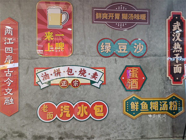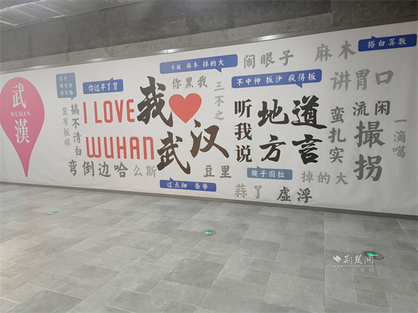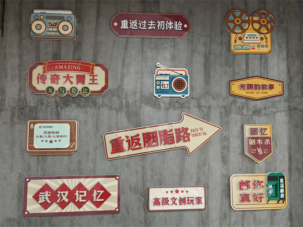 在武商超市胭脂路店前,那面“方言文化墻”便是最生動的注解。墻面中央,“我愛武漢”的大字旁,是“零醒、麻木、掉的大”“鬧眼子”“蠻扎實(shí)”等一串地道漢味俚語,保留了本土語言那股子鮮活、野性而直接的“脾氣”。側(cè)面墻上點(diǎn)綴的復(fù)古收音機(jī)、老式相機(jī)裝飾牌,與“重返胭脂路”、“武漢記憶”的標(biāo)識,共同構(gòu)成了一扇通往舊日時(shí)光的“穿梭門”。
