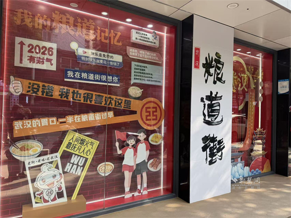 在工商銀行糧道街支行的墻面上,一個用紅色毛絨打造的巨型“?!弊盅b置,正伸出憨態(tài)可掬的“手臂”,熱情地向路人發(fā)出邀請——“抱一抱,福氣到”。配合地面“福氣UPUP”的躍動光影,冰冷的建筑立面被瞬間激活,化為一個充滿人情味與互動感的“福氣地標(biāo)”,吸引人們駐足擁抱、合影留念。就在一旁,一幅色彩斑斕的“武漢美食地圖”櫥窗徐徐展開,黃鶴樓的巍峨與熱干面、豆皮的市井風(fēng)味奇妙同框,卡通的吉祥物熱情招手,將“舌尖尋古味,巷深有乾坤”的故事,直觀地講述給每一位行人。