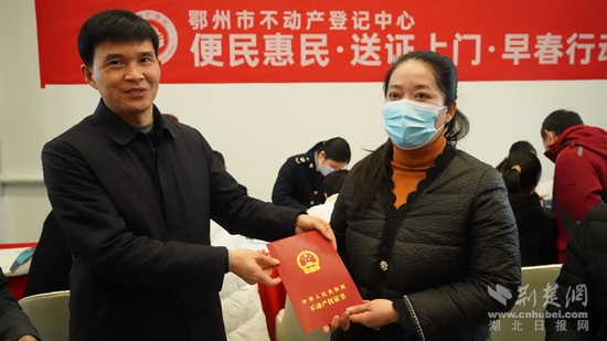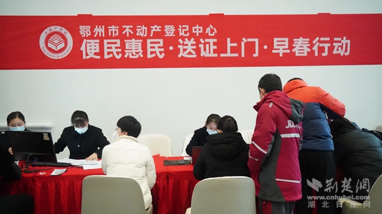 荊楚網(wǎng)(湖北日?qǐng)?bào)網(wǎng))訊(通訊員 周婷)3月22日上午,鄂州市不動(dòng)產(chǎn)登記中心開(kāi)展“便民惠民送證上門”活動(dòng),將辦證服務(wù)窗口延伸到楚天都市鑫園售樓部,現(xiàn)場(chǎng)接受購(gòu)房群眾申請(qǐng),現(xiàn)場(chǎng)受理,現(xiàn)場(chǎng)發(fā)證。