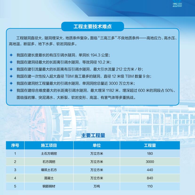 據(jù)介紹,工程輸水總干線采用有壓?jiǎn)味醋粤鬏斔鼐€地質(zhì)條件復(fù)雜,面臨強(qiáng)巖爆、突泥涌水、大斷裂、軟巖變形、高溫、有毒氣體等多重挑戰(zhàn),施工難度極大。工程設(shè)計(jì)與施工將再一次提升我國(guó)水利建設(shè)科技能力。