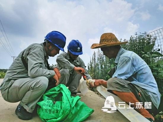 田紅云朋友圈中的這位微信好友是赤壁市供電公司的黨委書記余柒明。在得知斗門村農(nóng)田出現(xiàn)干旱的基本情況后,余柒明立即組織車埠供電所“星火”黨員志愿服務(wù)隊(duì)的志愿者們趕到現(xiàn)場(chǎng)勘查旱情,在向農(nóng)戶了解抽水灌溉的實(shí)際困難后,他們頂著高溫,將低壓線路引至遠(yuǎn)處的水源地,裝設(shè)電能表、漏電保護(hù)器、連接抽水泵,經(jīng)過(guò)一個(gè)多小時(shí)的作業(yè),讓水嘩啦啦流入了農(nóng)戶干涸的農(nóng)田。