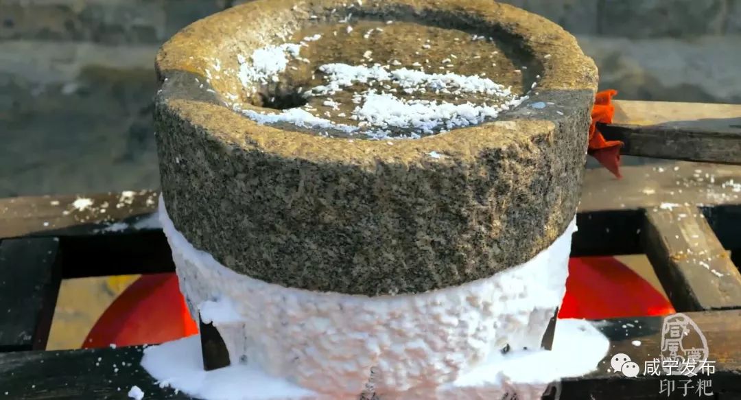 糯米淘洗后浸泡兩三個(gè)小時(shí),或舂或磨做米粉,這是做印子粑的第一道工序。