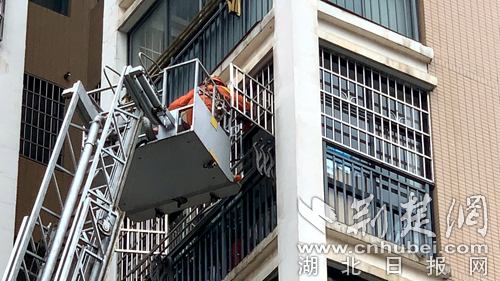 消防員坐云梯車深入室內(nèi)救援。 (通訊員 肖幫治 攝)