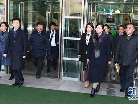 1月21日,朝鮮三池淵管弦樂團(tuán)團(tuán)長(zhǎng)玄松月(前右二)通過朝韓邊境的韓國(guó)京畿道坡州市京義線韓朝出入境事務(wù)所前往韓國(guó)首爾。當(dāng)日,朝鮮方面派遣三池淵管弦樂團(tuán)團(tuán)長(zhǎng)玄松月率領(lǐng)的考察團(tuán)經(jīng)由京義線陸路抵韓,為平昌冬奧會(huì)之際舉行的文藝演出進(jìn)行事先考察。(新華網(wǎng))