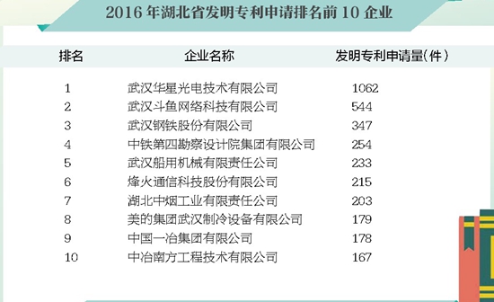 2016年湖北省發(fā)明專利申請(qǐng)排名前10企業(yè)